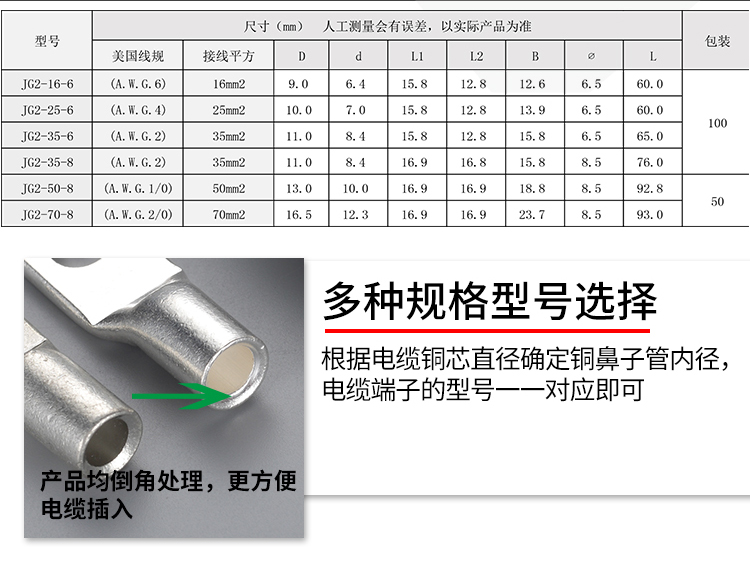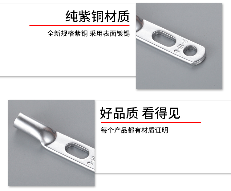 品牌:益展牌 材質(zhì):紫銅表面鍍錫。 適用:華為、思科,電信、移動、聯(lián)通等通信設(shè)備電纜終端設(shè)備連接。 常用的有兩種:1.酸洗,酸洗過的顏色和紅銅的本色基本相同,能起到美觀抗氧化更利于導(dǎo)電。 2.鍍錫,鍍錫后的銅鼻子表面為銀白色,能更好的防氧化和導(dǎo)電,并可防止銅在導(dǎo)電過成中產(chǎn)生的**氣體擴散。 注意事項:1.螺釘一定要擰緊 2.電纜和銅鼻子一定要插到位并用鉗子壓緊 銅鼻子又稱線鼻子、銅接線鼻子、銅管鼻,接線端子等,各地方和各行業(yè)叫法不一 采用優(yōu)質(zhì)銅板沖壓,其應(yīng)用領(lǐng)域廣泛,如變壓器,穩(wěn)壓器,及各種發(fā)電機,通訊電纜等 用途:適用于配電裝置中銅導(dǎo)線的連接,分16平方,25平方,35平方,50平方,70平方等鍍錫雙孔銅鼻子 作用:連接、減少損耗、載流量全接觸、更換方便、電壓損失小。