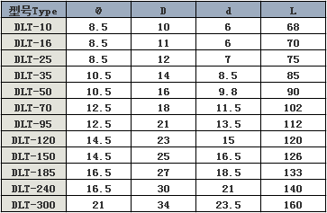 用途 :DTL系列銅鋁接線端子適用于配電裝置中各種圓型,半圓扇型鋁線,電力電纜與電氣設(shè)備銅端的過渡連接。使用鋁材為L3,銅材為T2。產(chǎn)品采用磨擦焊工藝制造,具有焊縫強(qiáng)度高,通電性能好,抗電化腐蝕,使用壽命長等等特點(diǎn)
