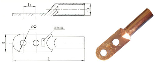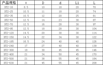 雙孔銅鼻子,DT2系列,使用T2紫銅棒壓制而成,連接安全可靠,外表可鍍錫。 |